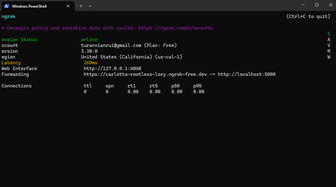 - Ngrok 启动后,你的命令行窗口会显示类似下面这样的界面: