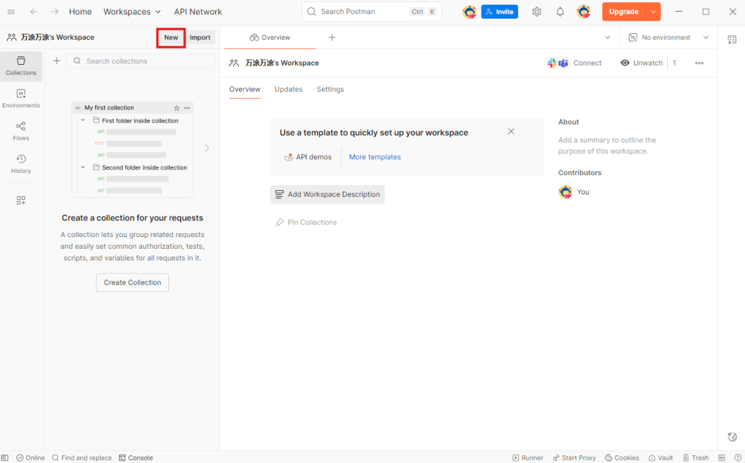 - 在主界面上方,找到 “New” 按钮并点击,来新建一个请求。
