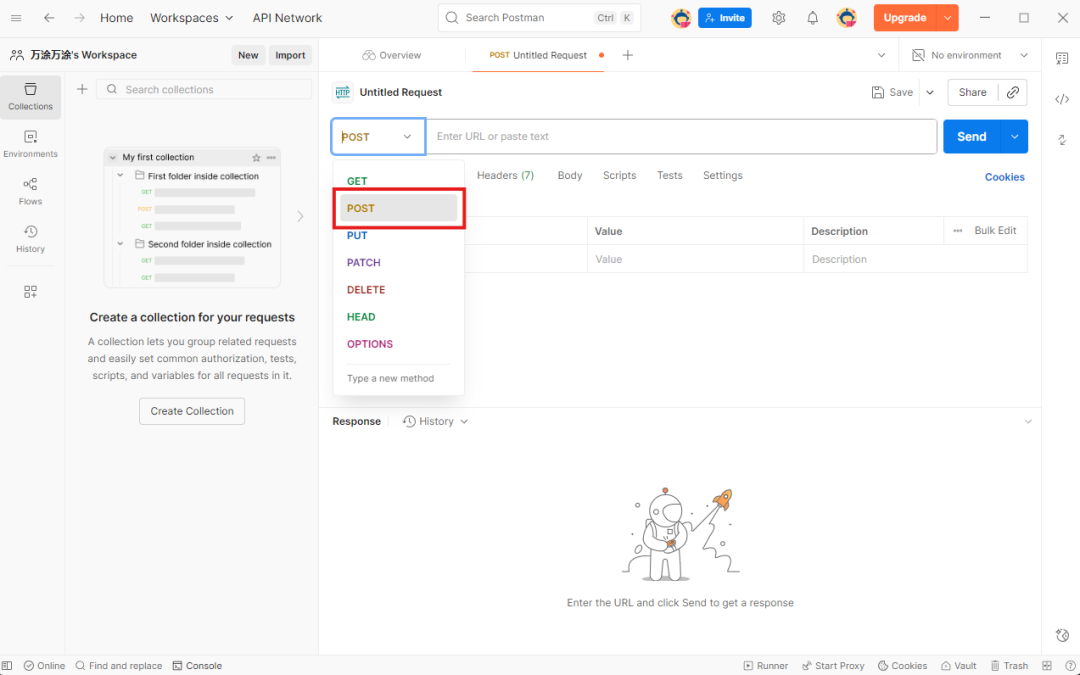 - 新建一个请求,在请求方法下拉框里,把 GET 改成 POST。