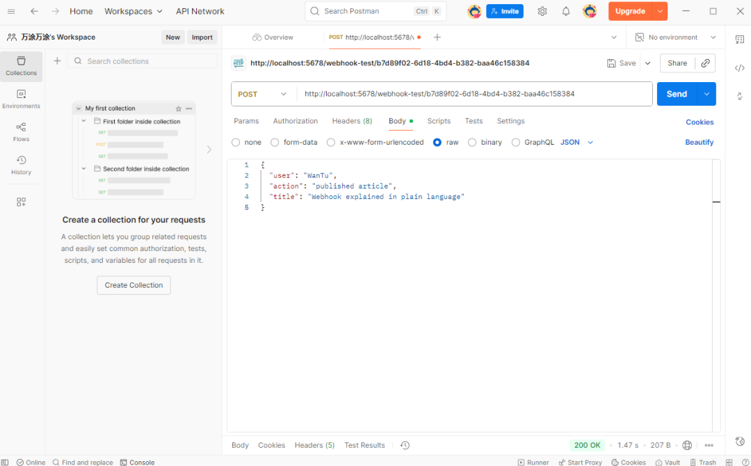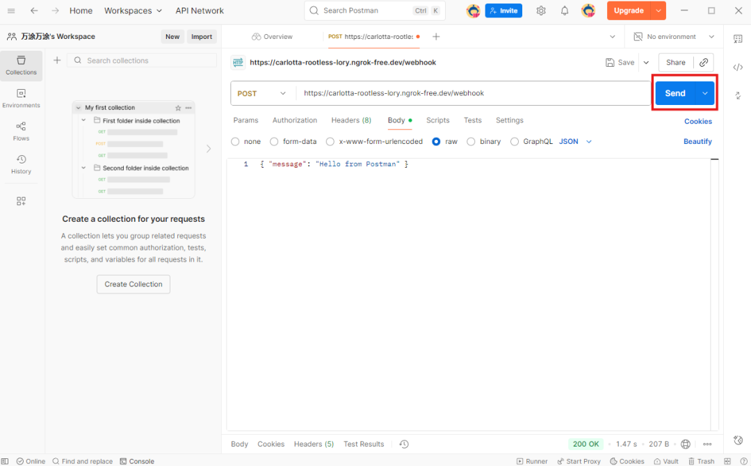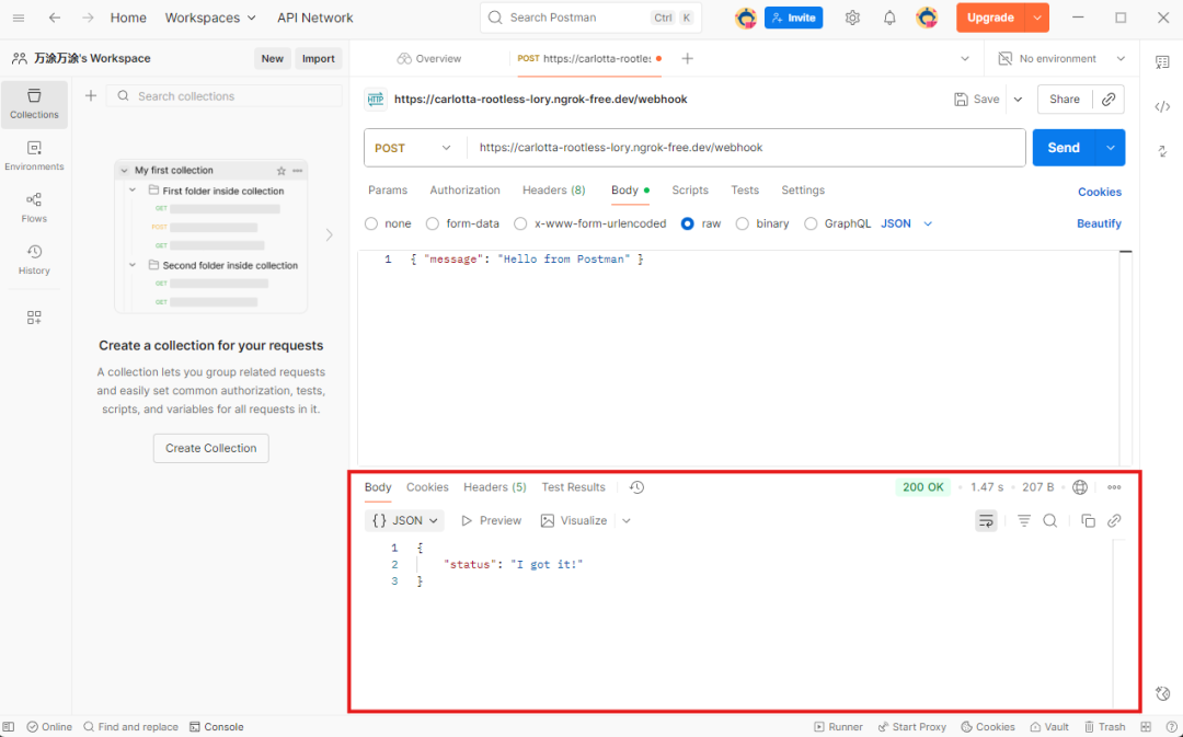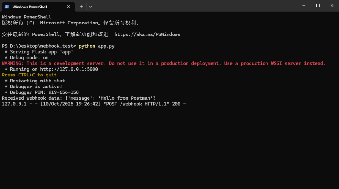 - 在你第一个命令行窗口 (运行 app.py 的那个): 你会看到打印出了 Received webhook data: {'message': 'Hello from Postman'} 的字样。