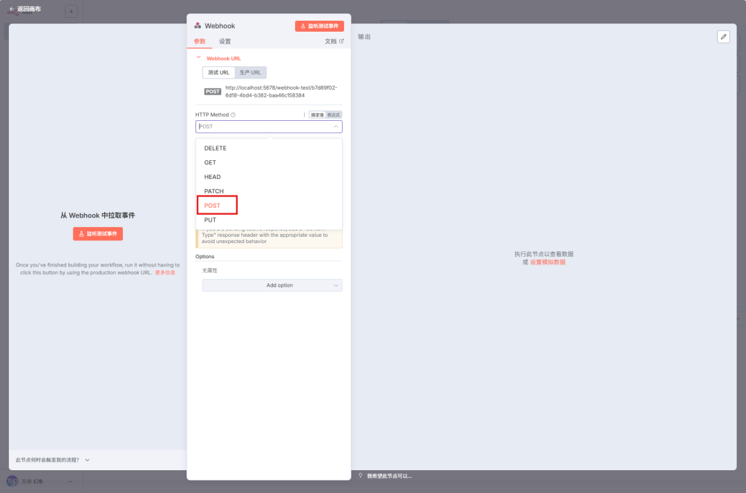 - 打开节点设置,找到 HTTP Method,把它从默认的 GET 改成 POST。