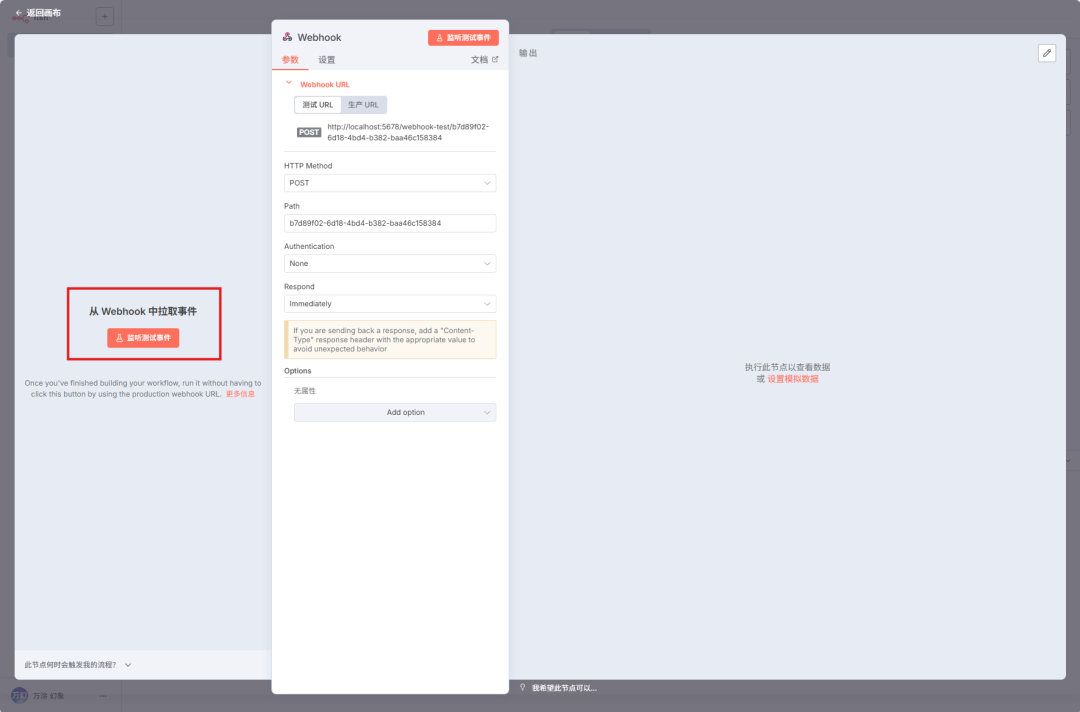 - 关键操作:点击 “Listen for Test Event” 按钮。你会看到它变成了一个等待状态。这个动作,就相当于告诉 n8n:“ 我准备好了,现在开始竖起耳朵等信号”。