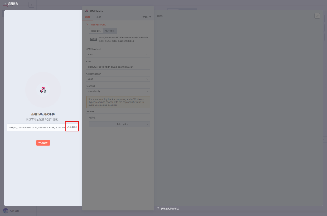 节点进入监听状态后,你会在 Webhook URLs 下看到一个 Test URL。点击它旁边的复制按钮。