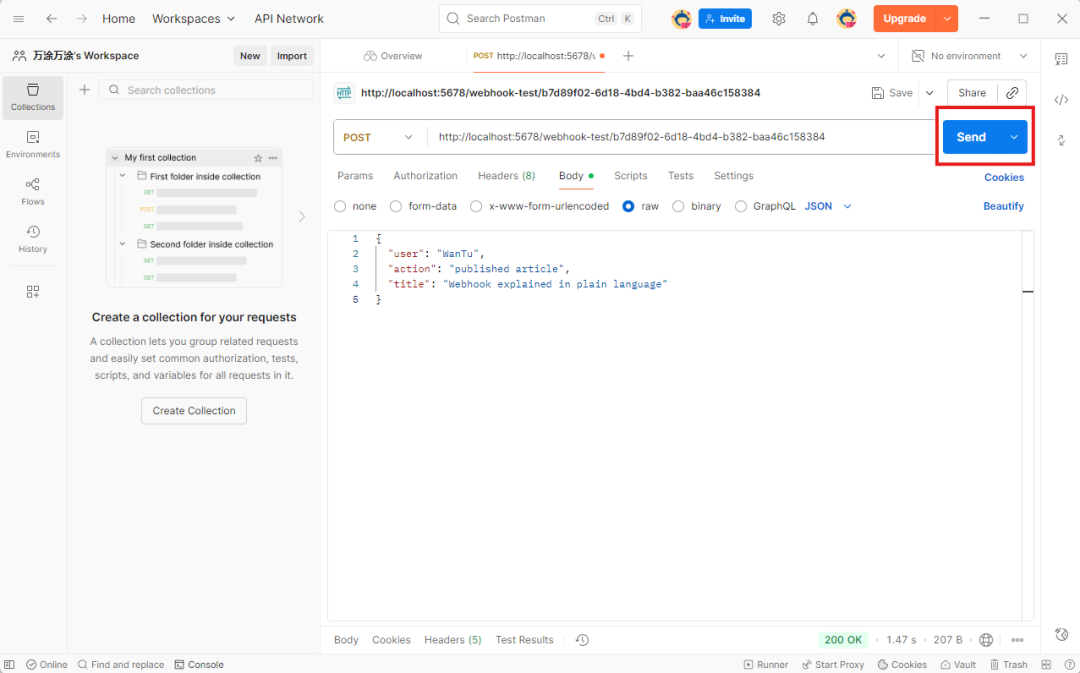 - 打开 Postman,新建一个 POST 请求,把刚才复制的 n8n 的 Test URL 粘贴进去。