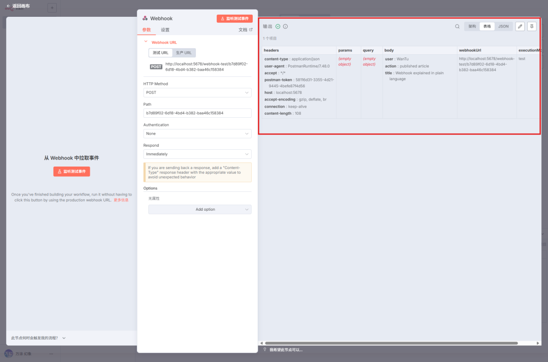 - 发送成功后,你切回 n8n 的界面,会发现 Webhook 节点已经“ 亮了”,并成功捕获到了你从 Postman 发送的数据。