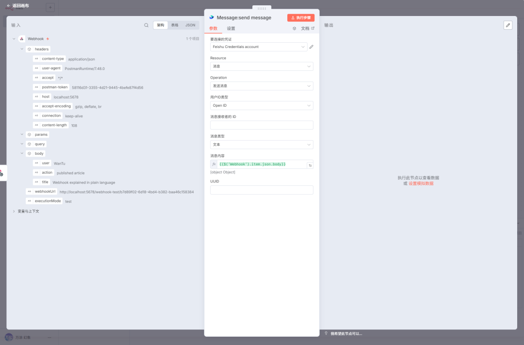 理论、代码、工具都盘完了,咱们最后回归到那个最初的问题场景:“ 用 n8n 通过 webhook 发送飞书信息”。