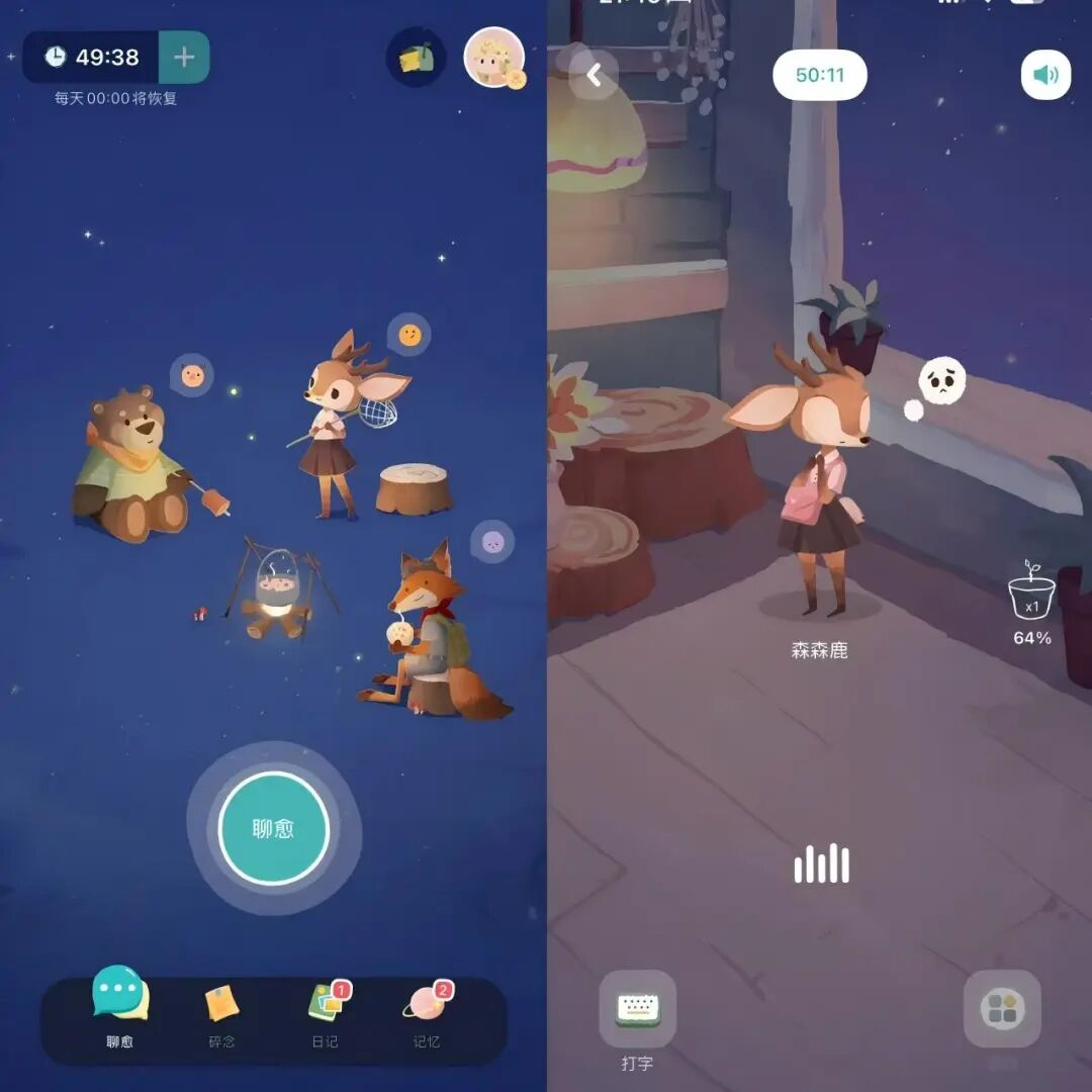 这些产品的典型特征是大多具备 1-2 个差异化特点,能吸引用户 「留」 下来。比如 「LoveyDovey」 涵盖了包括二次元、KPOP 等丰富的角色 IP 库,抓住追星人群的心理特点,搭建阶梯式的好感养成机制,能满足她们的陪伴价值。「林间聊愈室」 则是以动物的非拟人化形象,以游戏化的方式帮助用户分析情绪。