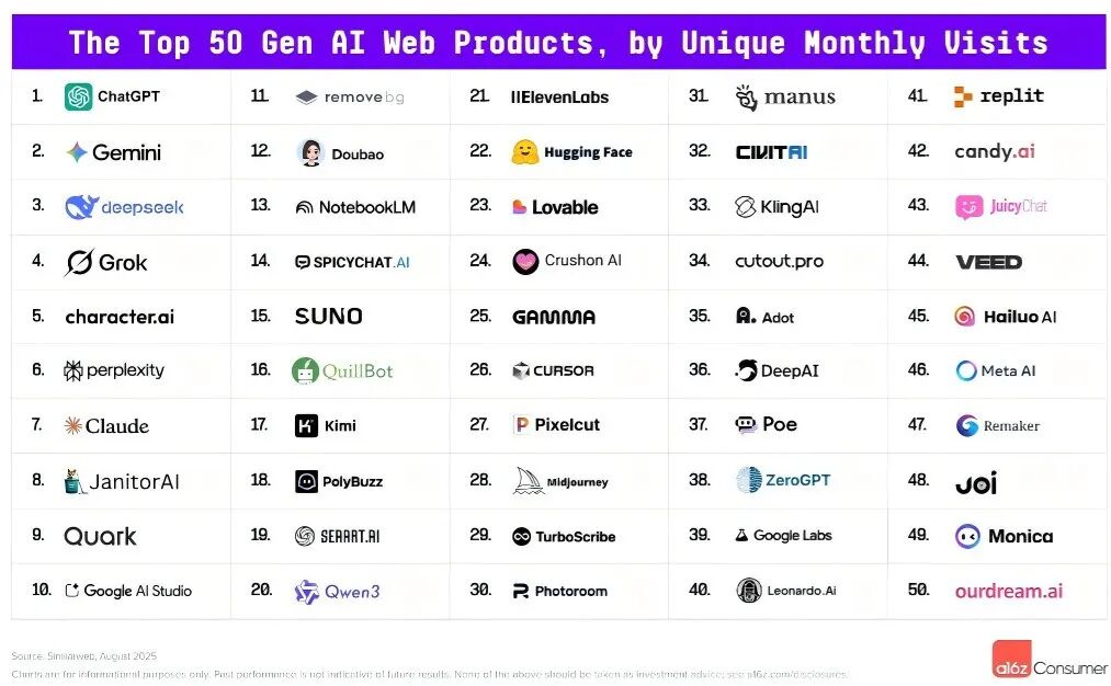 到了 2025 年,据 a16z 今年 8 月发布的第五版榜单,连续霸榜的 AI 陪伴公司实际仍有不少。