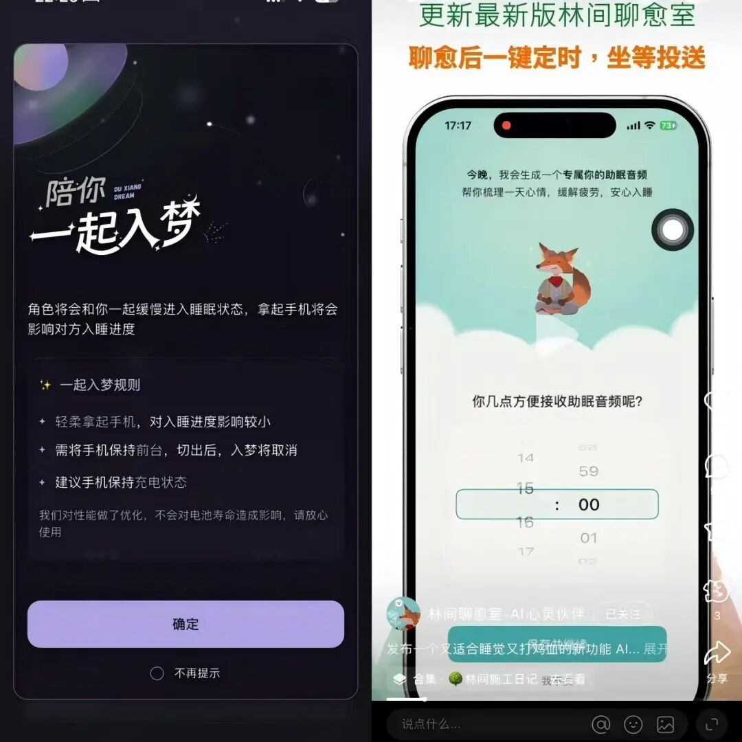 3、虚实结合。实现真人社交和 AI 社交的融合,如 「Tolan」 就引入了好友机制,用户互加好友后,可以访问对方的星球,尝试让虚拟陪伴成为真实社交关系网络的一环。除此以外,包括 「独响」 的 「一起入梦」 功能、「林间疗愈室」 的 「早晚安助眠音频」,这些小功能的创新都是为了实现用户的长期留存。