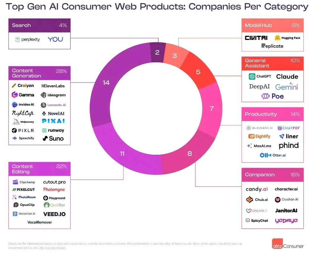 2024 年,a16z 在当年 3 月发布的报告指出,AI 陪伴已成为主流,有 10 家产品入选 「全球最火的 50 个 AI 应用」 榜单,如 Poly.AI、Crusho.AI、Janitor.AI、candy.ai、SpicyChat.AI、DreamGF.AI、Chub.ai 等。