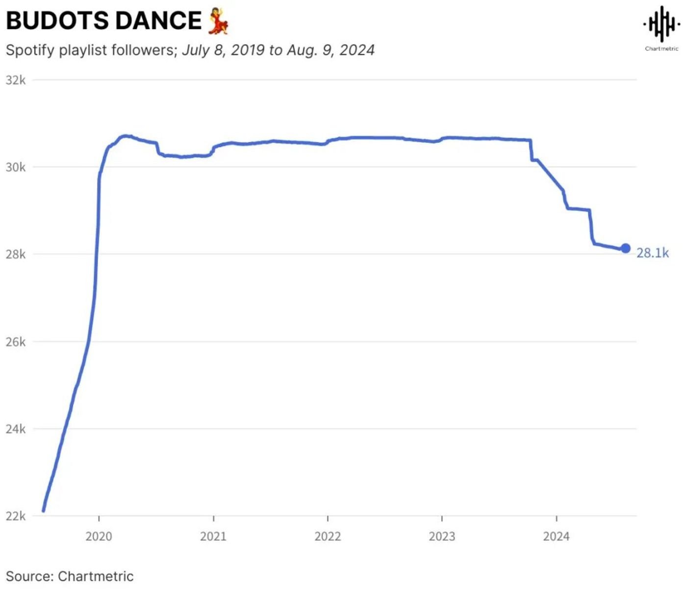 自 2018 年起,Spotify 上的播放列表 「BUDOTS DANCE」 便开始陆续收录了 97 首 Budots 风格音乐作品,至今已经吸引了超过 2.8 万用户的关注。从下图可以看出,在 2019 年到 2020 年期间,这个播放列表的关注者数量急剧增加,从大约 2.2 万人上升到超过 3 万人。