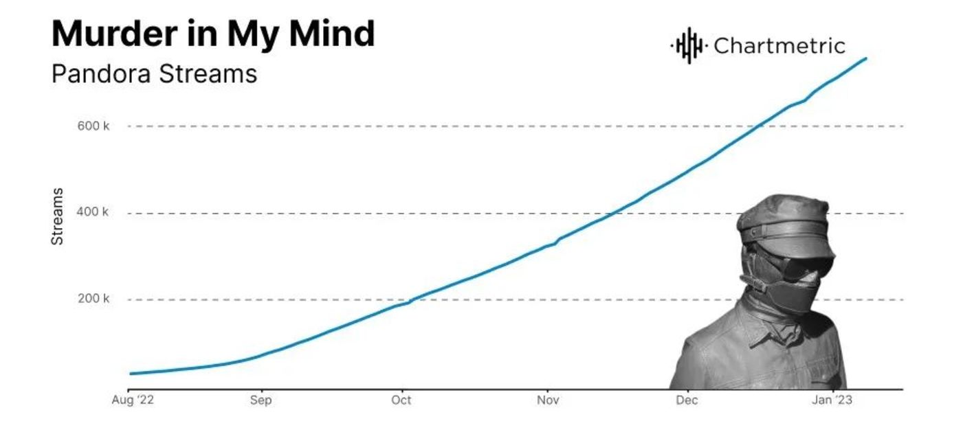 以 2022 年在 TikTok 上爆火的嘻哈音乐的子流派 Phonk 为例,Kordhell 的 《Murder In My Mind》 在 Spotify 上超过 6 亿次,在 TikTok 视频内容数量达到 100 万。TikTok 用户经常将这首歌作为背景音乐,配合赛车高速漂移、游戏卡点、爱豆出场画面,让 Kordhell 甚至成为了当年 Chartmetric 增长最快的艺术家之一。
