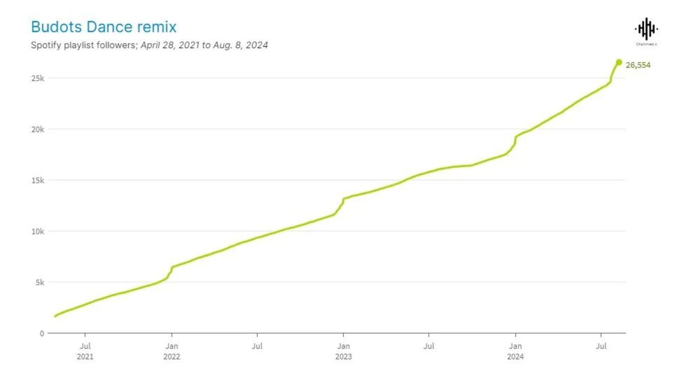此外,越来越多的 Budots 播放列表也紧随潮流,出现在 Spotify 上。如播放列表 「 Budots Dance Remix 」 的关注量在七月底大幅度增加。