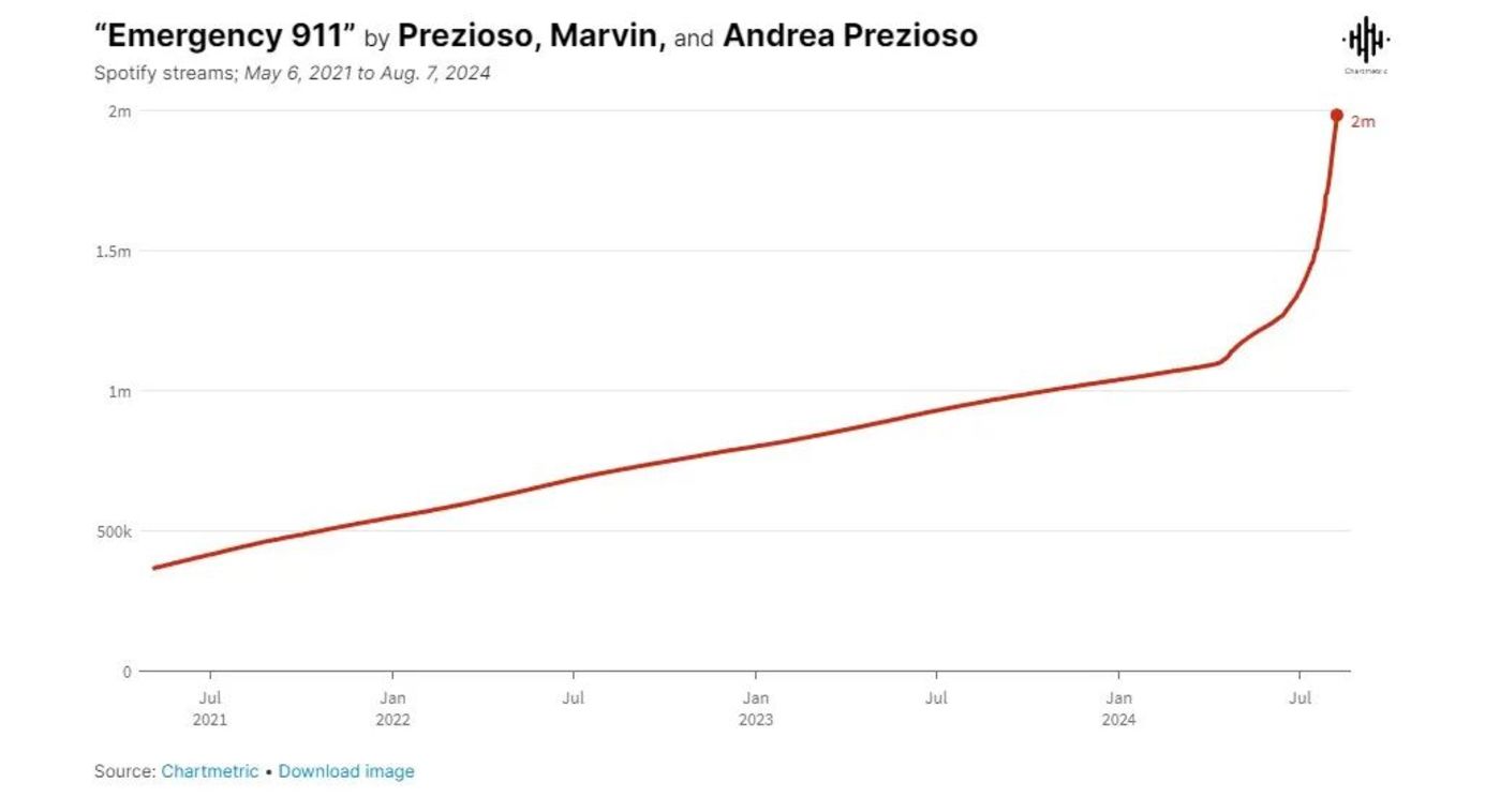 有趣的是,意大利音乐制作人 Prezioso、Marvin 和 Andrea Prezioso 在 2000 年发行的音乐 《Emergency 911》,因其名称和结构与 《Emergency Budots》 相似,在 Spotify 上的播放量也显著增加。特别是在 2024 年 8 月,该歌曲的播放量达到了约 200 万次的高峰,这显然得益于与 《Emergency Budots》 的关联效应。