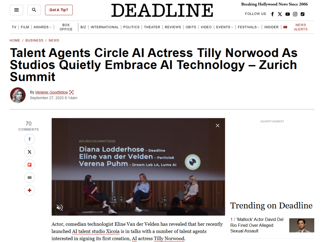 9 ⽉底,在瑞⼠苏黎世电影节的⼀场⾏业峰会上,Particle6 公司的创始⼈兼 CEO Eline Van der Velden 高调宣布,⼀个名叫 Tilly Norwood 的“AI ⼥演员” 正获得多家好莱坞经纪公司的⻘睐,签约在即。