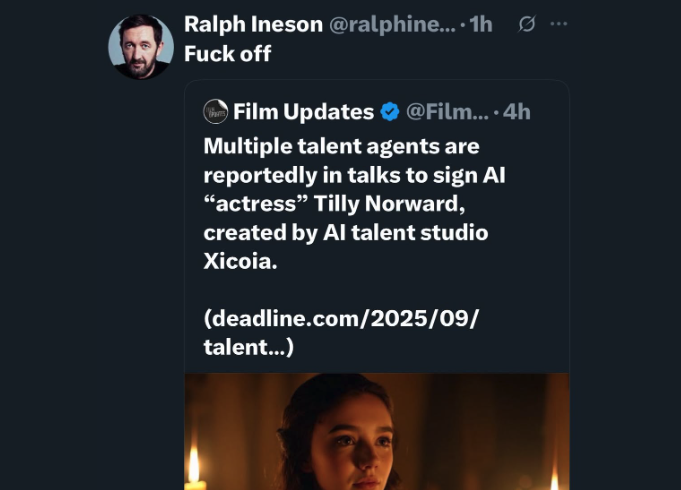 Van der Velden 在公开分享了 Tilly Norwood 的即将签约经纪公司的消息后,基本上在业界获得了一边倒的批评。