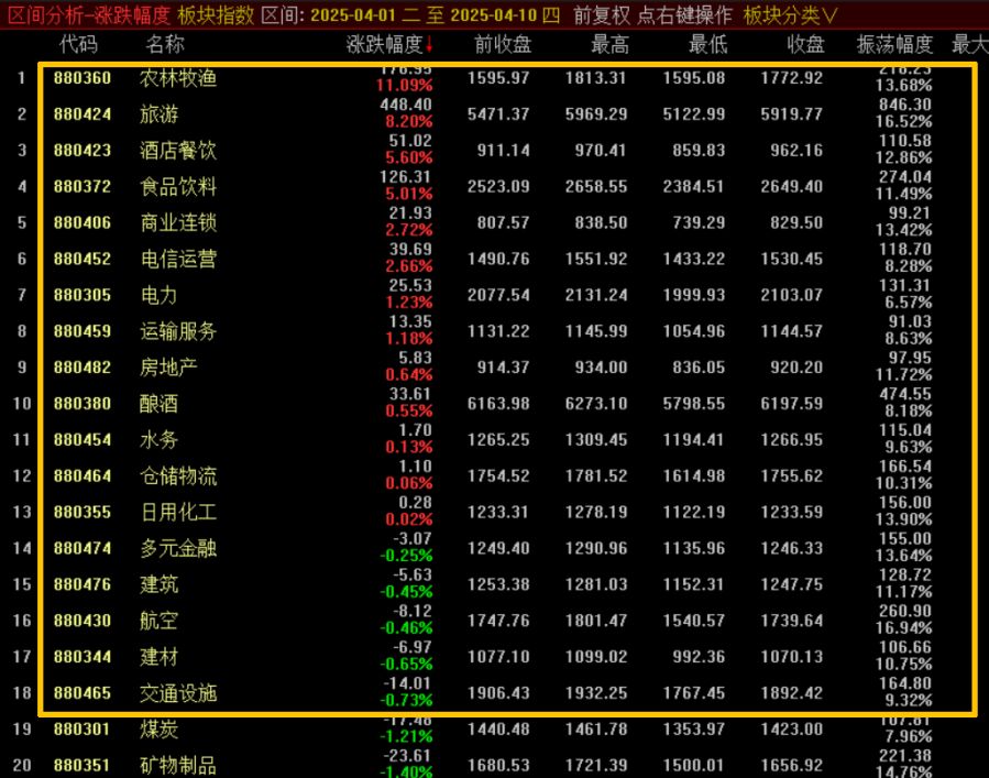 从行情数据来看,4 月份那波极端波动,对冲板块就是农业和消费。军工类板块表现相对抗跌,但并不出众。