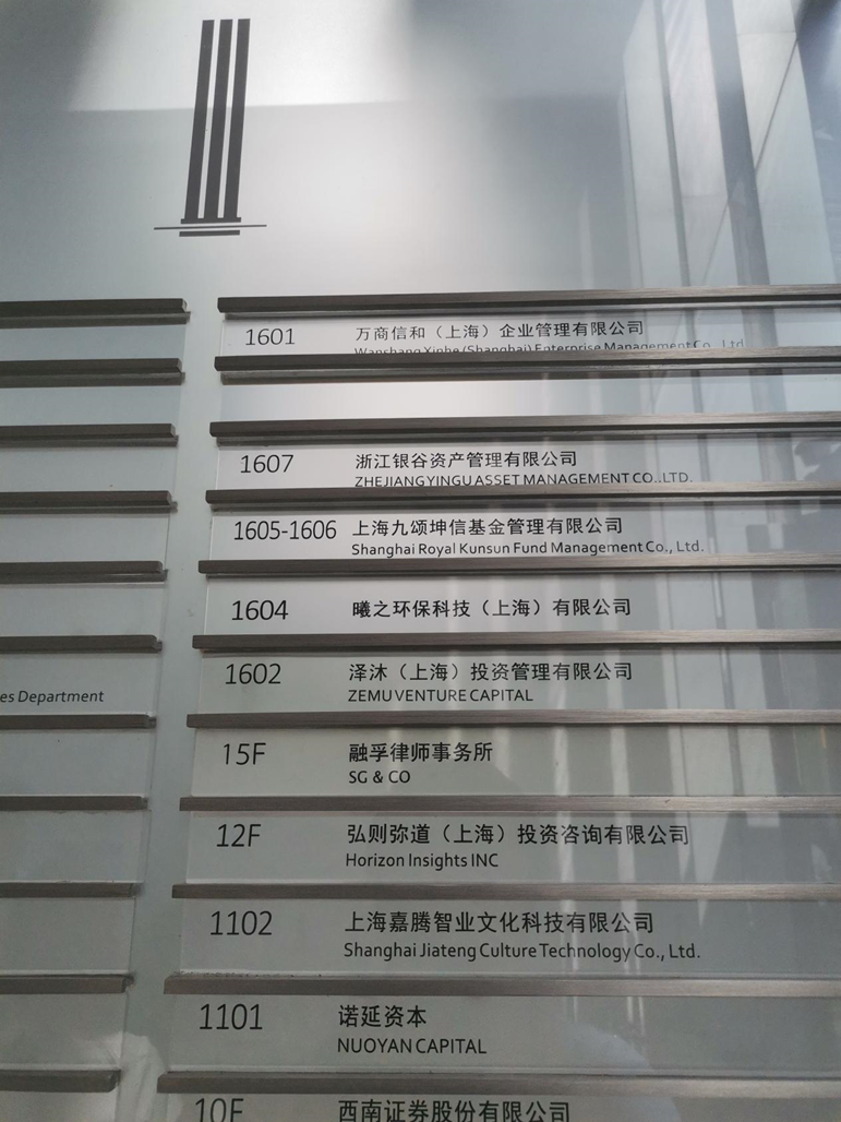 10 月 10 日下午,《每日经济新闻》 记者来到位于上海浦东陆家嘴地区的上海九颂山河办公场所,只见一间办公室的前台幕墙上 「九颂山河」 四个大字处于最显眼位置,下方九颂坤信、银谷资产、九颂律所三家单位并列。