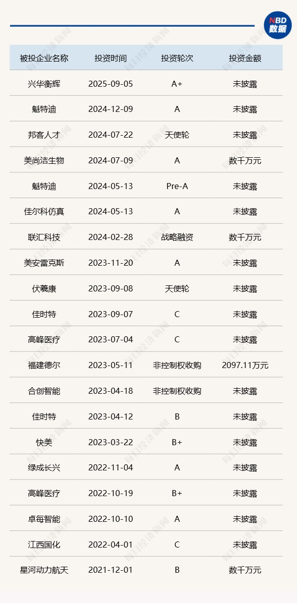 根据投中数据和公开资料,记者对九颂山河的投资情况做了一个不完全统计。整体而言,这家机构的投资领域广泛,重点覆盖医疗健康、智能制造、网络科技、化工新材料以及碳中和等多个领域。在智能制造方面,九颂山河关注先进半导体、集成电路、新能源、机器人与智能装备等细分领域。尽管近年来九颂山河的投资案例并不算很多,但其合作名单中不乏一些知名企业。