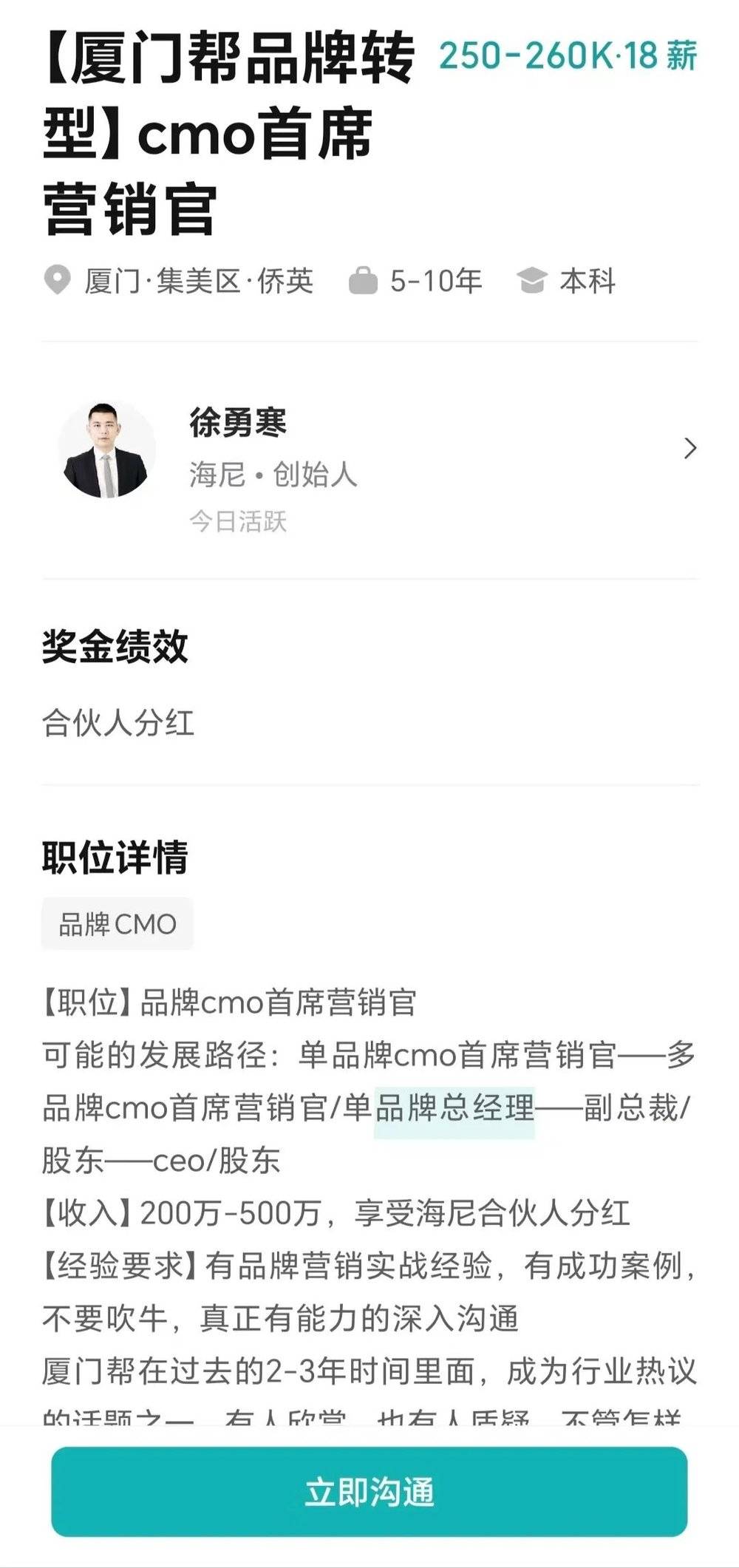 人才上的变化十分直观。过往,厦门帮的核心人力全集中在投手和内容运营岗位,鲜有品牌岗位设置。今年起,头部公司开始密集招聘品牌营销端、研发端人才。如今在 BOSS 直聘内,海尼集团公开招聘配方工程师、品牌总监、品牌策略师等,创始人徐勇寒更是直接开出 500 万年薪和分红,招聘 CMO 助力品牌转型。