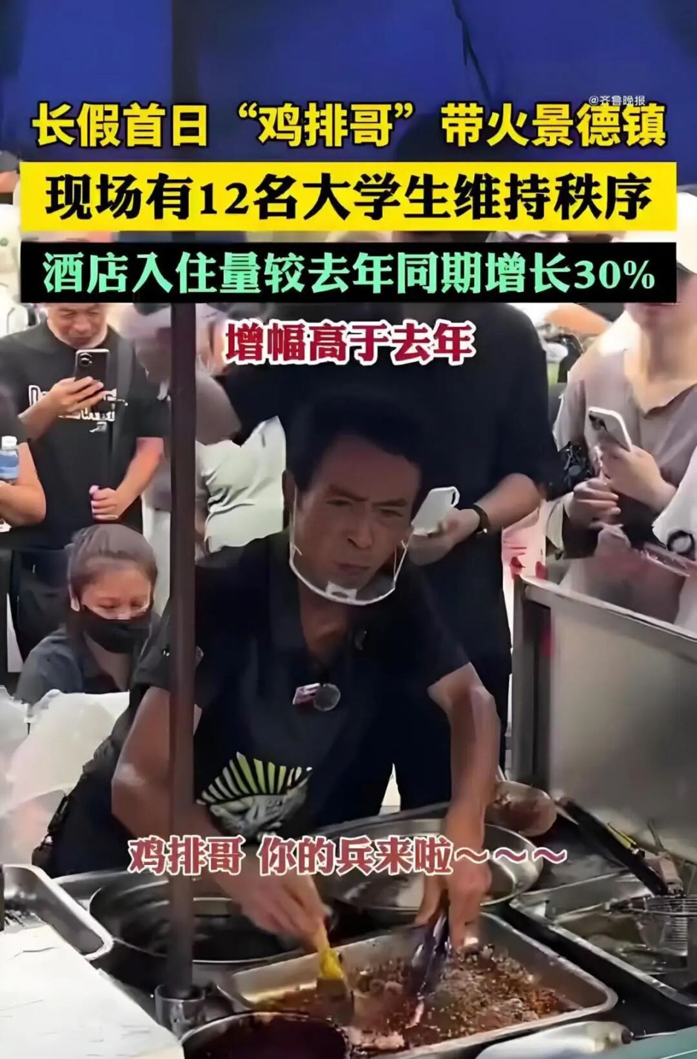 而在江西景德镇,鸡排哥还在那口小摊上,穿着那件被油烟染成深褐色的 T 恤,一边炸鸡排,一边笑着和客人聊天。他没 logo、没装修、没系统,甚至连个像样的灯牌都没有。但他的摊子前,天天排队。