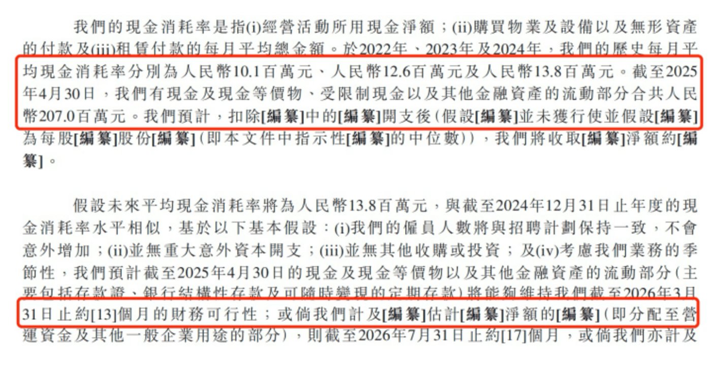 截至 2025 年 4 月 30 日,五一视界持有的现金及现金等价物、受限制现金,叠加其他金融资产的流动部分,合计约 2.07 亿元。若公司未来每月平均现金消耗率维持在 1380 万元水平,现有资金储备预计可支撑五一视界约 13 个月的运营,财务可行性可覆盖至 2026 年 3 月 31 日。