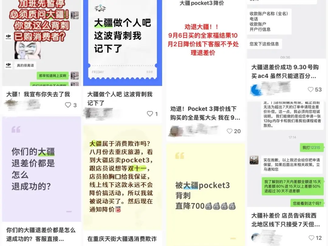 在小红书上,像冰冰这样的消费者还有很多。10 月 9 日开始的这波降价,恰好让许多在 9 月底为国庆出行而购机的用户,错过了“7 天价保” 的期限。“ 大疆把消费者当傻子” 等话题在小红书上发酵,引发热议。