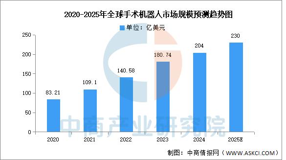 中商产业研究院的报告显示,2023 年全球手术机器人市场规模达到约 180.74 亿美元,2024 年约为 204 亿美元,近五年年均复合增长率达 23.75%。
