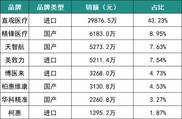 根据高端医械院数据,2025 年第一季度销售额前八品牌中,进口品牌数量与国产品牌数量持平,均为 4 家,前三名中有两名为国产品牌。