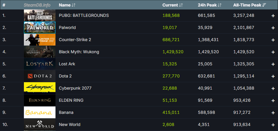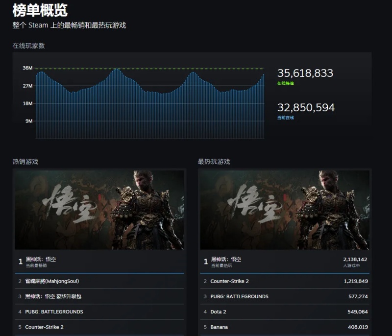 上线仅半天,《黑神话:悟空》Steam 在线人数就超过 140 万。随着晚间到来,更多社畜下班回家加入到 「西游」 的行列中,昨日晚间 《黑神话:悟空》 达成了 2223179 人同时在线的成就,这一数字已经超越了今年年初突然爆火的 《幻兽帕鲁》(2101867 人),创下国产游戏记录。