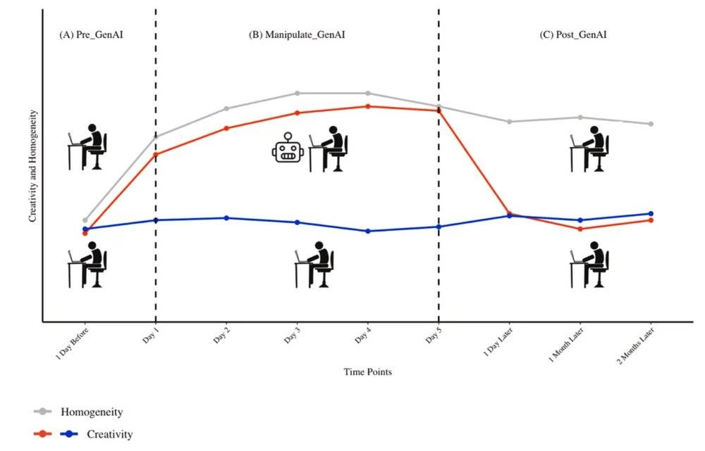 Zhou,Y.,Liu,Q.,Huang,J.,&Li,G.(2025).Creative scar without generative AI:Individual creativity fails to sustain while homogeneity keeps climbing.Technology in Society,103087.