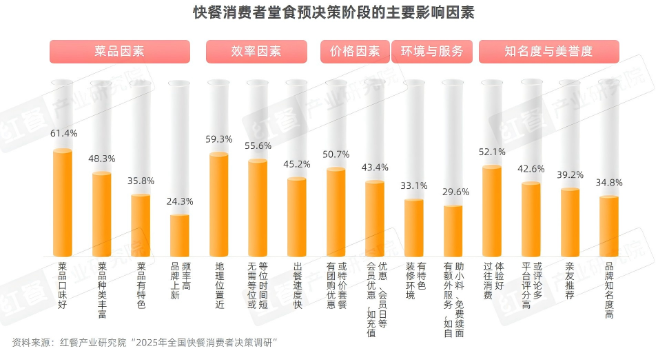 红餐产业研究院“2025 年全国快餐消费者决策调研” 显示,82.1% 的消费者在前往门店堂食之前,会通过一些平台或者渠道搜索更充分的品牌信息,以做出更优的决策。