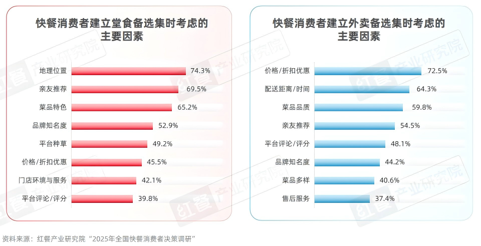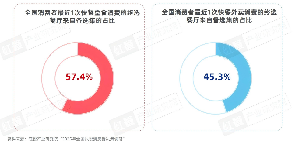 值得注意的是,即便品牌成功进入消费者的快餐备选集,也未必能确保其成为最终的消费选择。红餐产业研究院“2025 年全国快餐消费者决策调研” 显示,在最近 1 次快餐堂食消费中,57.4% 的消费者最终就餐的餐厅是来自其备选集;而在最近 1 次快餐外卖消费中,仅有 45.3% 的消费者最终下单餐厅是来自其备选集。