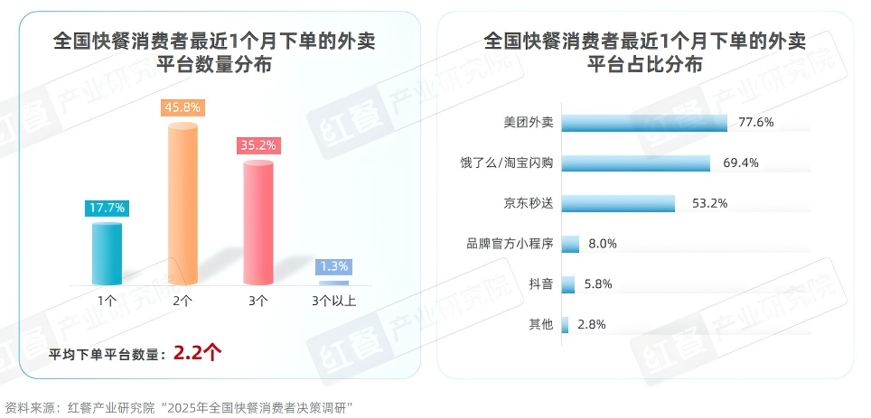 实际上,在线上外卖消费场景中,消费者对平台的忠诚度普遍较低,多数消费者倾向于通过多平台对比信息 (如商家、菜品、价格、配送费及配送时效等) 来优化选择,其中价格是核心关注点。红餐产业研究院“2025 年全国快餐消费者决策调研” 显示,91.3% 的快餐消费者在点外卖时出现了“ 多平台跳转” 行为;82.3% 的快餐消费者最近 1 个月在两个及以上外卖平台上下单了外卖。