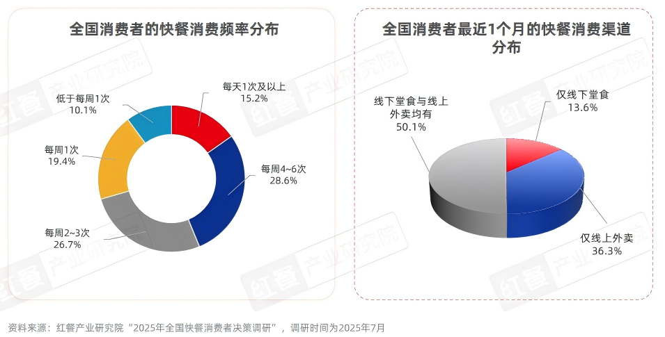 红餐产业研究院“2025 年全国快餐消费者决策调研” 显示,每周至少消费 2 次快餐的消费者占比为 70.5%,每周至少消费 1 次快餐的消费者占比接近九成。