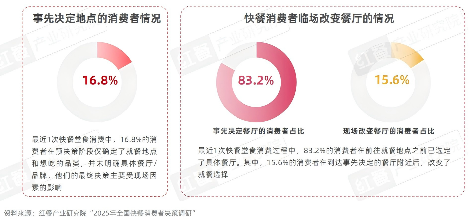 红餐产业研究院“2025 年全国快餐消费者决策调研” 显示,最近 1 次快餐堂食消费中,83.2% 的消费者在预决策阶段已选定了具体餐厅,其中,15.6% 的消费者在到达事先决定的餐厅附近后,改变了就餐选择。