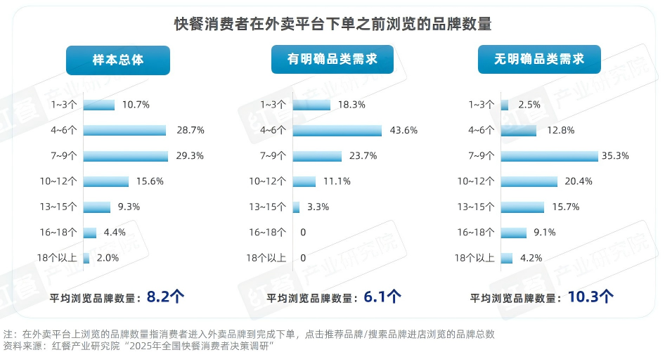快餐消费者在进入外卖平台之后,普遍通过多品牌信息浏览进行决策匹配。据红餐产业研究院“2025 年全国快餐消费者决策调研”,从进入外卖平台到完成下单,快餐消费者平均会浏览 8.2 个品牌,其中,无明确品类需求的消费者的平均浏览品牌数量更多,达到 10.3 个,而有明确品类需求消费者的平均浏览品牌数量仅为 6.1 个。