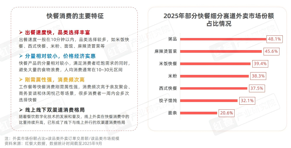 此外,随着近年来餐饮数字化技术的发展和普及,线上外卖在快餐消费中的比重持续升高,已形成了线下与线上并行的双渠道消费格局。红餐大数据显示,截至 2025 年 9 月,粥品和麻辣烫/冒菜的外卖市场份额占比已超过了四成,米饭快餐、米粉、西式快餐和饺子馄饨的外卖市场份额占比则均超过了三成。
