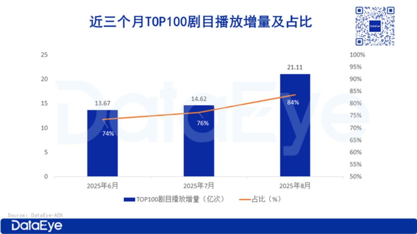 值得关注的是,动态漫剧播放量向头部高度集中。近 3 个月,TOP100 漫剧贡献了绝大部分流量,且占比逐月攀升。以 8 月为例,当月 TOP100 漫剧播放增量达 21.11 亿次,占据大盘播放增量的八成以上。