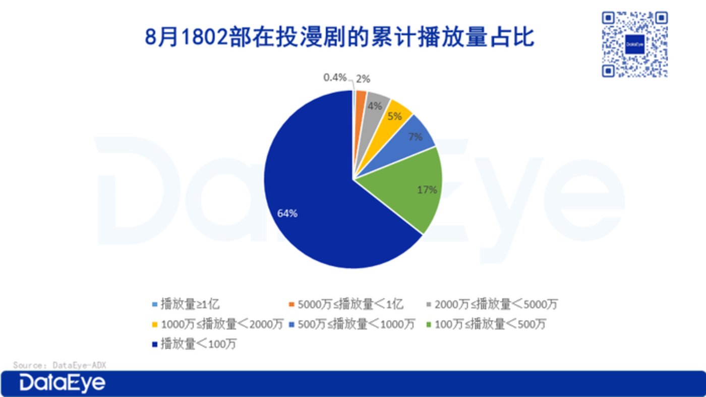 如果统计 8 月 1802 部在投漫剧的累计播放量,分化现象更为显著。具体来看,播放量破 1 亿的仅 8 部,占比 0.4%;46 部超 5000 万次 (占比 2.6%);213 部超 1000 万次 (占比 12%);而 64% 的漫剧累计播放量不足 100 万。这意味着多数漫剧沦为 「陪跑员」。