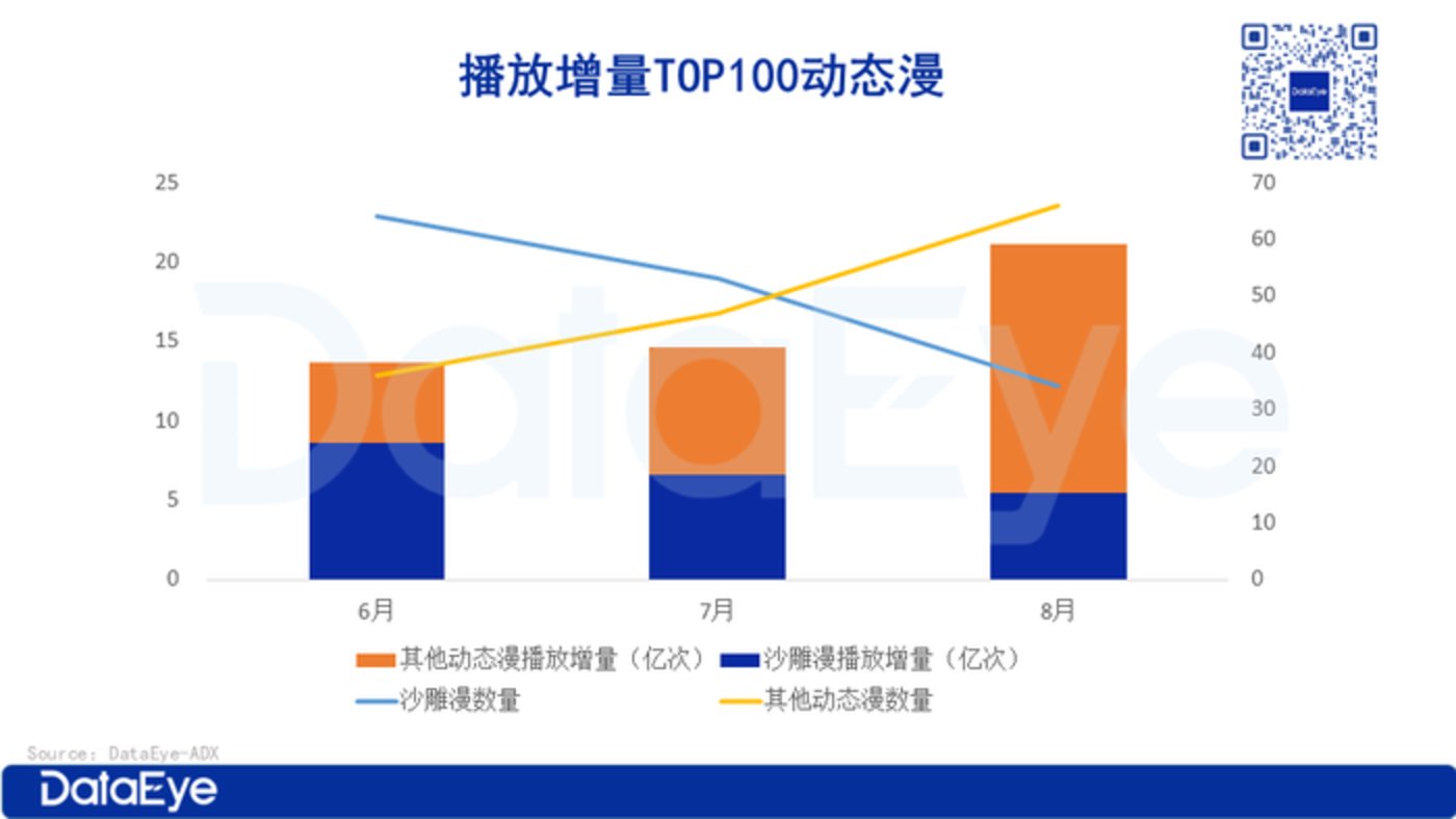 与之相对,其他类型动态漫逆势增长,8 月播放增量达 15.63 亿次,是沙雕漫的近 3 倍,这一变化显示观众审美正从单一娱乐向多元题材延伸,也反映出行业从低成本试水向精品化创作转型的趋势。