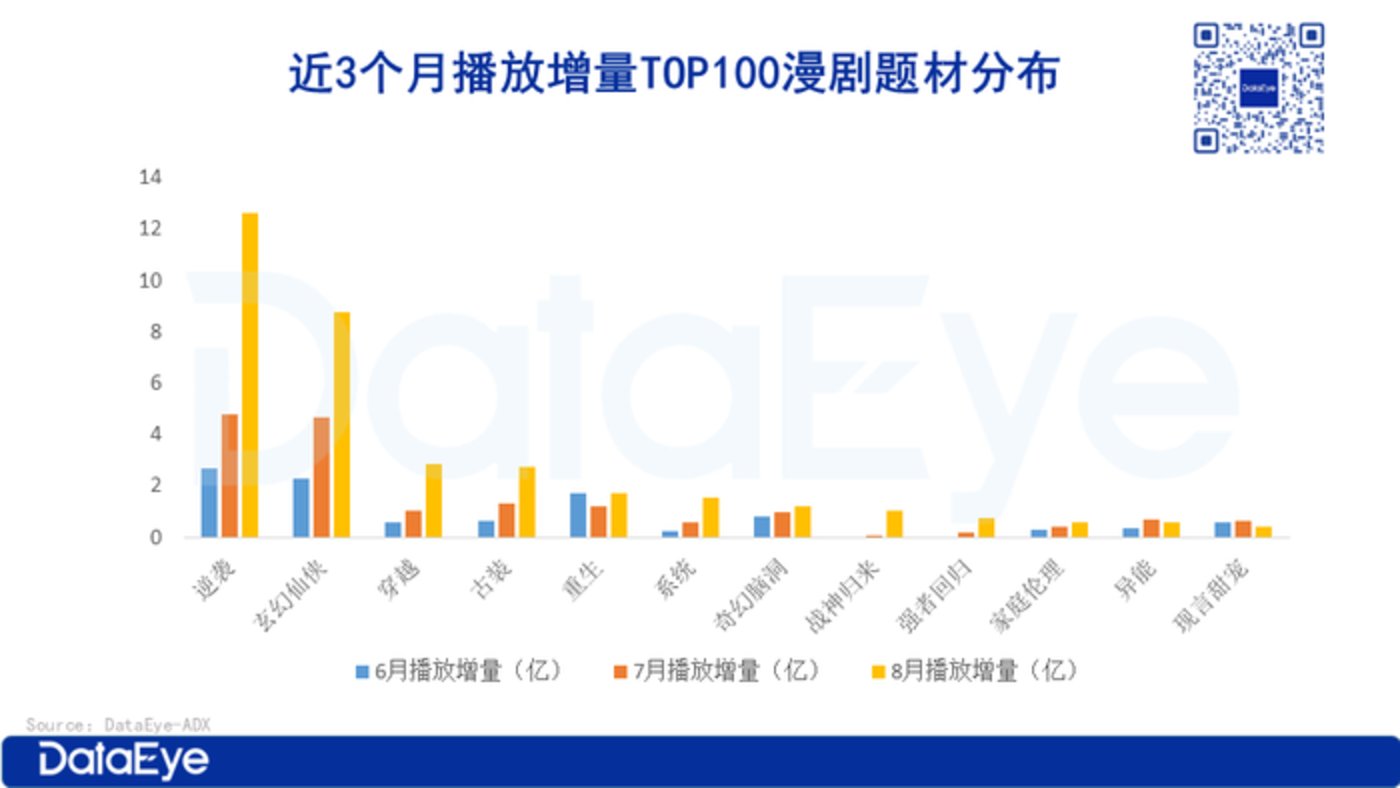 从题材热度看,近 3 个月播放增量 TOP100 漫剧中,逆袭、玄幻仙侠题材热度呈断崖式领先,堪称行业"流量密码"。这类题材借助 AI 技术能低成本呈现宏大世界观与特效场景,契合观众对"爽感"内容的需求。同时,漫剧题材日趋多元化,穿越、古装、系统、战神归来、强者回归等题材热度持续攀升。