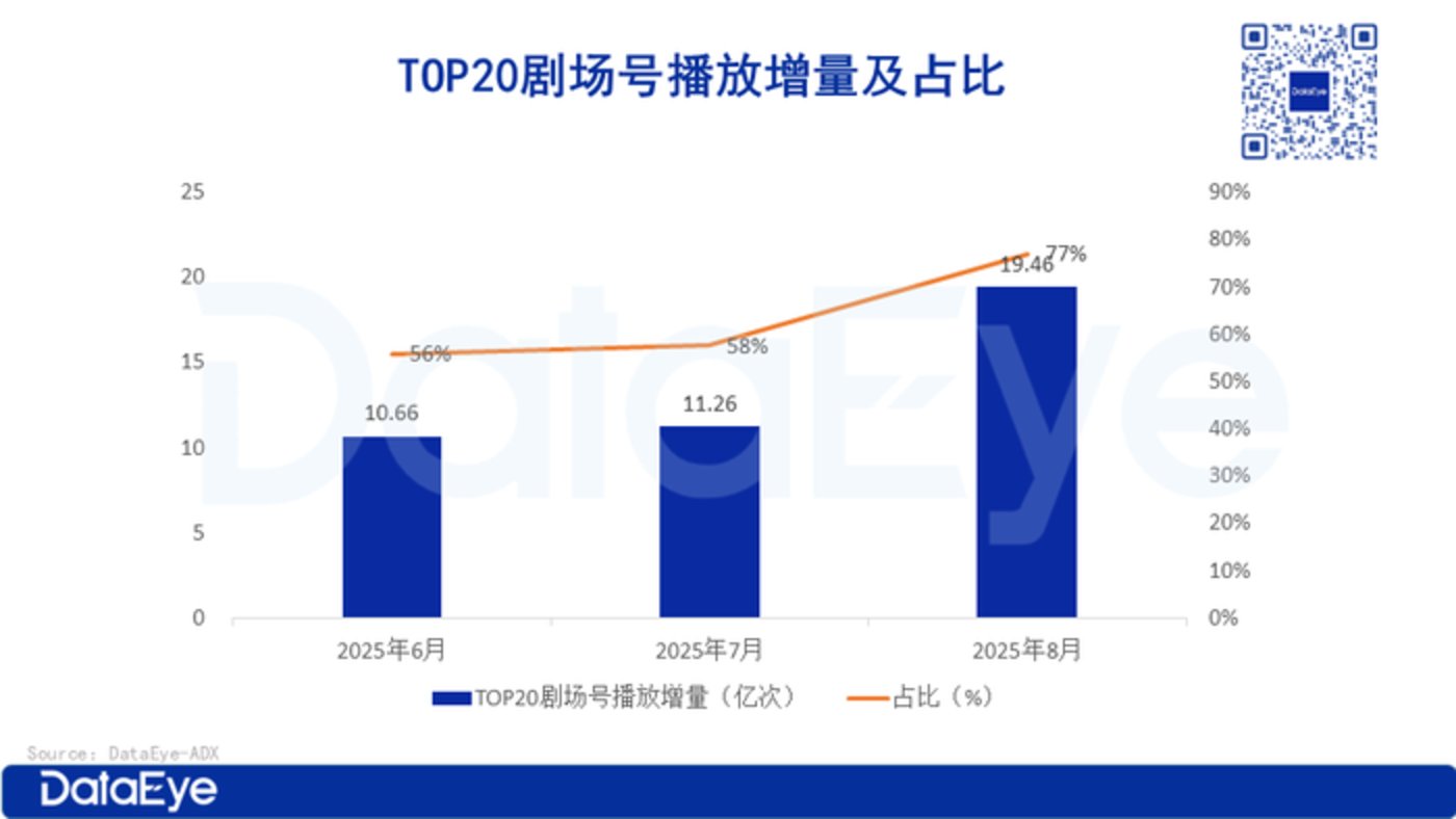 动态漫剧场号的流量集中度也在快速攀升。近 3 个月,TOP20 剧场号的播放增量占比从 56% 升至 77%。在刚过去的 8 月,近 400 个剧场号中,TOP20 剧场号的播放增量达 19.46 亿次,占比达 77%。