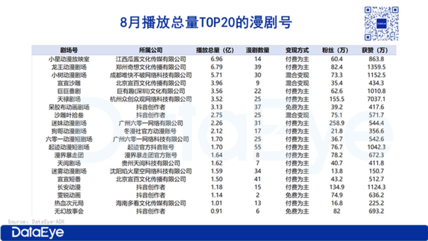 我们梳理了 8 月播放总量 TOP20 的漫剧号,发现: