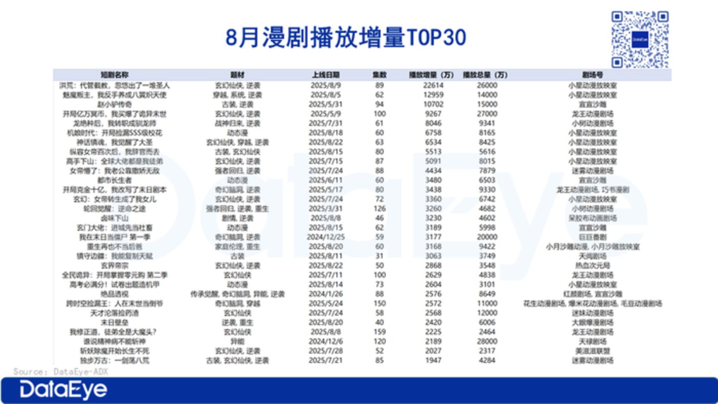 8 月漫剧播放增量 TOP30 榜单中,《洪荒:代管截教,忽悠出了一堆圣人》 登顶榜首,《魅魔叛主,我反手养成八翼炽天使》 与 《赵小驴传奇》 分别位列第二、三名。