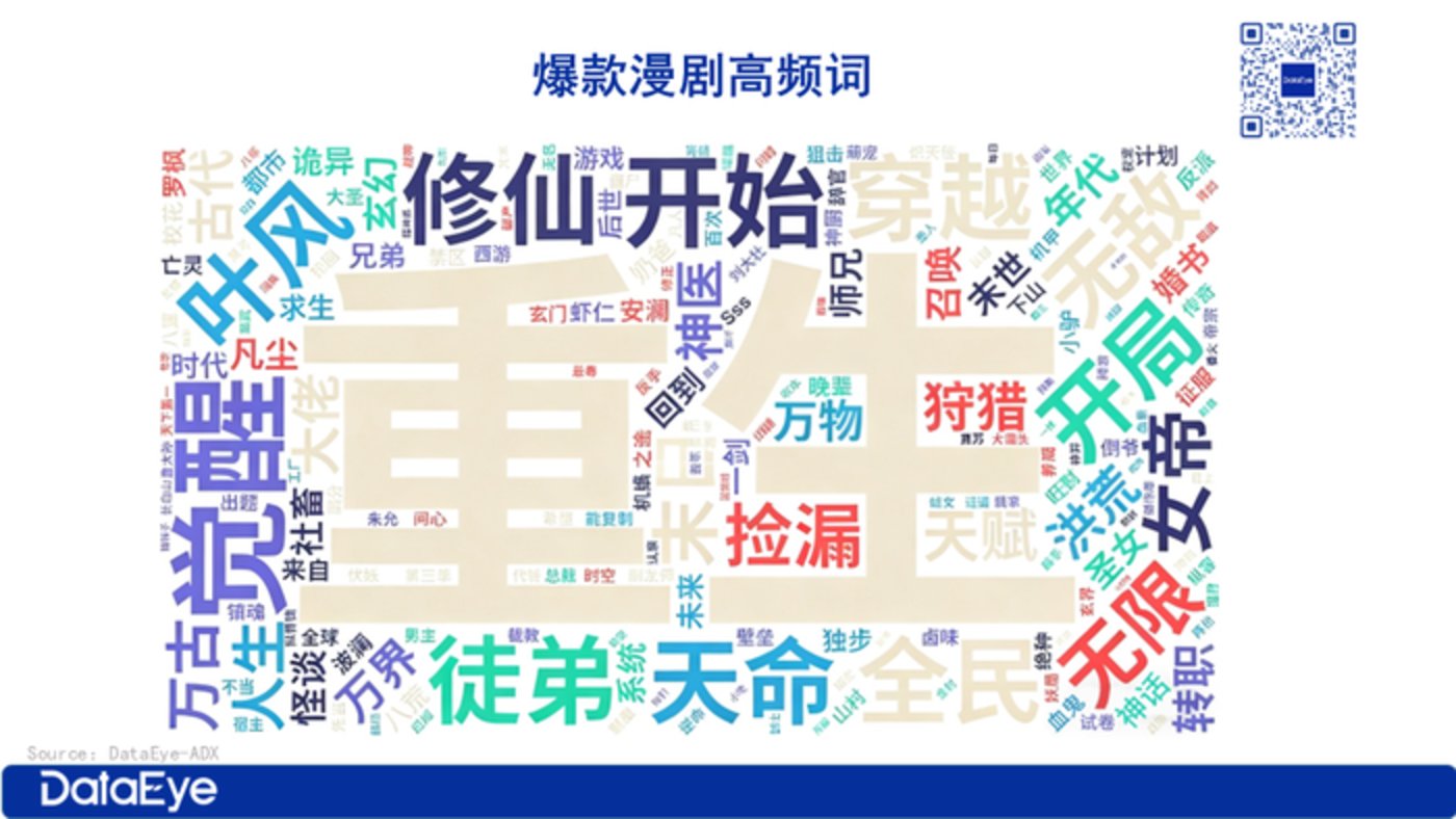 对近三个月播放增量 TOP100 的漫剧标题进行拆解后,高频热词包括重生、觉醒、修仙、天命、穿越、女帝等。从题材属性来看,这些高频热词均指向强冲突、高爽感的男频内容,与此前 TOP30 榜单中逆袭、玄幻仙侠题材的高热度形成呼应。