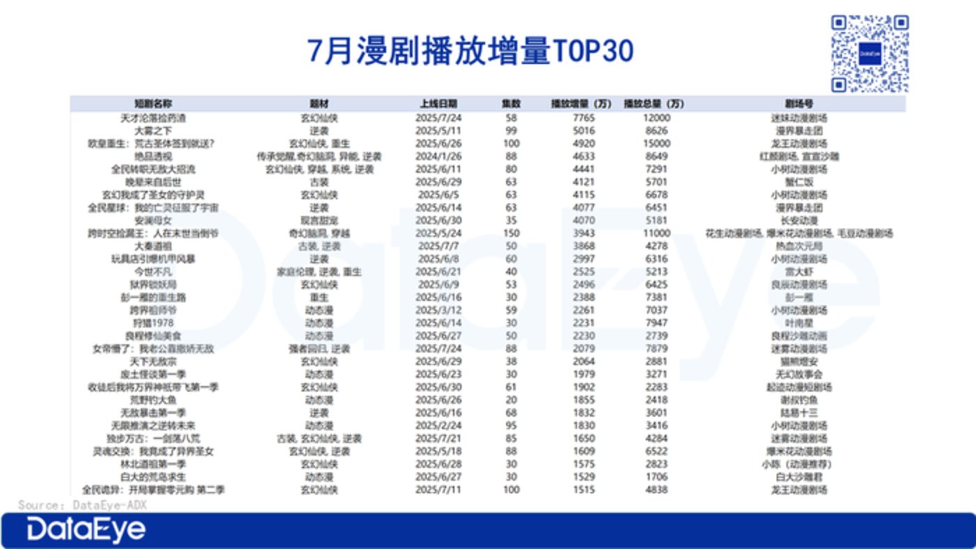 7 月漫剧播放增量 TOP30 榜单中,《天才沦落捡药渣》 登顶,《大雾之下》 第二,《欧皇重生:荒古圣体签到就送?》 第三。