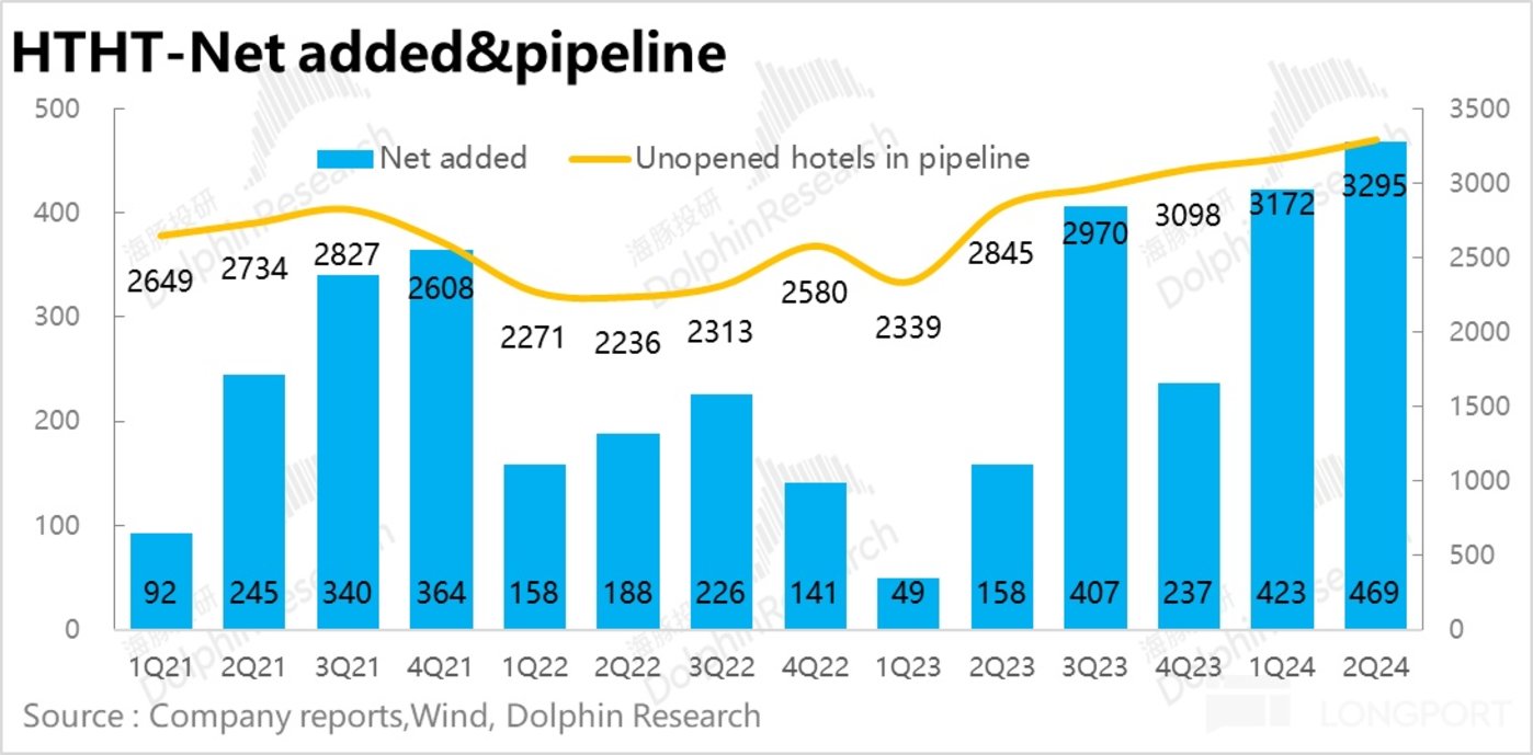 2、尽管近几个季度供需景气度有所走低,但华住的开店节奏却在提速。本季合计净新开酒店 469 家,相比上季度增长了 46 家。待开业酒店数量接近 3300 家,也比上季增多 120 多家。公司此次也宣布 24 年全年开业新酒店的目标由 1800 家上调到 2200 家,明确体现华住要加速开店的意图。相对逆周期的开店策略,虽逻辑上有助于公司的市占率,但短期内也可能对盈利产生压力。