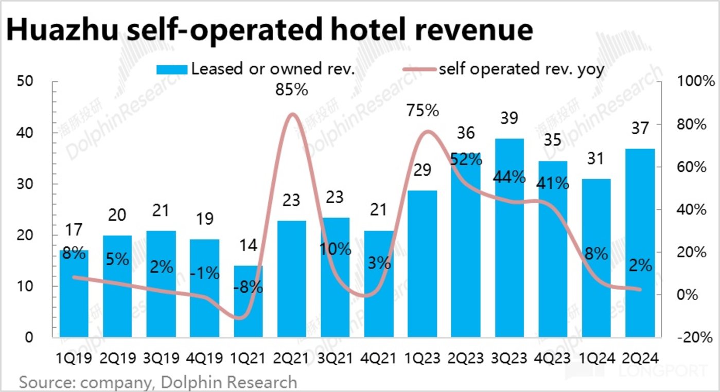 营收层面,本季度华住集团整体营业的增速继续放缓到了 11%,相比市场预期多出 1.1 亿。不过因为收入口径不同,门店数减少的自营业务收入的重要性被过于放大。