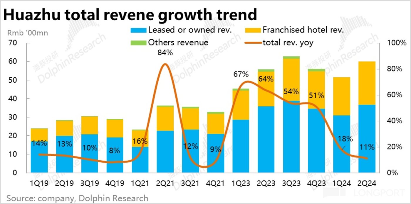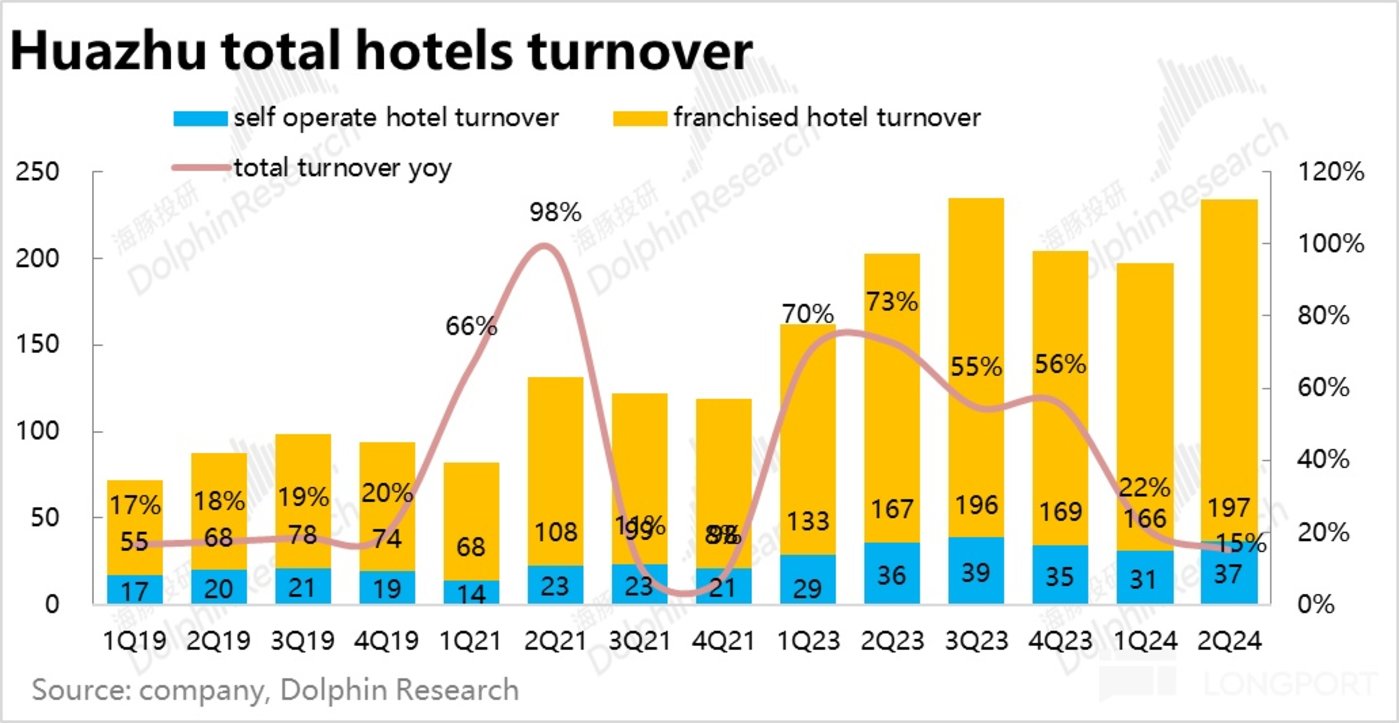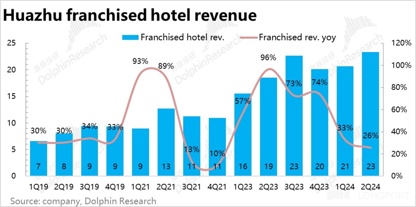 华住直营业务,因酒店数量净减,收入增速仅剩 2%。但加盟业务的营收仍保有同比 26% 的增速,虽也在环比降速但依旧不俗。且相比流水 18% 的增速更高,换言之,华住在加盟业务中变现率也是提升的。